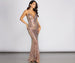 Bring that million dollar shine as you make a luxe entrance in our Joan sequin taupe dress! She features a sleeveless bodice. a plunging wired V neckline. corded straps that cross at the back and a partially open back that leads to a lower back zipper closure. Her waist features a narrow waist band accent that leads to curve hugging floor length sheath silhouette. She is composed of a mesh fabric adorned with iridescent sequins that reflect flicks of blue and purple shine. Dress is lined with a form hugging mini skirt length smooth knit fabric that offers a slight stretch.