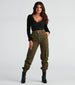 Remind everyone of your fashion status! These high-rise twill cargo joggers are sure to command the room. They feature a front button. hidden zipper closure. belt loops. four-pocket styling. and elasticized cuffs. Complete the look in a cute henley crop top and mules.