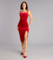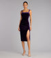 The Julie formal dress blends soft velvet texture with a sculpted. form-hugging silhouette. The square neckline and daring front slit create an elegant balance of sophistication and subtle allure—perfect for when the invite calls for something effortlessly refined.