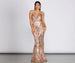 Radiate and glow from the inside out in our charming Julieanne dress! She features a sleeveless bodice. a plunging V neckline with built in no slip strip and a double row of spaghetti straps that leads to a cross back design. Her slim fit bodice leads to a floor length silhouette with a flared hemline. The all over lined mesh fabric is adorned with glitzy sequins set in a scroll print pattern. Dress offers a form hugging fit with minimal stretch. Includes a back zipper closure.
