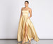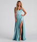 Radiate effortless elegance in our sophisticated satin Juliet gown! She features adjustable spaghetti straps. a V-neck seamed bodice with light padding at bust. a high-seam waist. and a long. gently pleated A-line skirt with pockets at either hip and a dramatic center front slit. Juliet is fully lined and made from a smooth. shiny satin-like woven fabric with a touch of stretch. Pair this beautiful dress with a shimmering rhinestone necklace for a glamorous look.