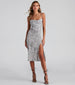 You're the queen of the jungle in this leopard midi dress featuring a sleeveless. cowl neck. spaghetti straps. slim-fit silhouette. and a sultry front slit. Complete the look in heels.
