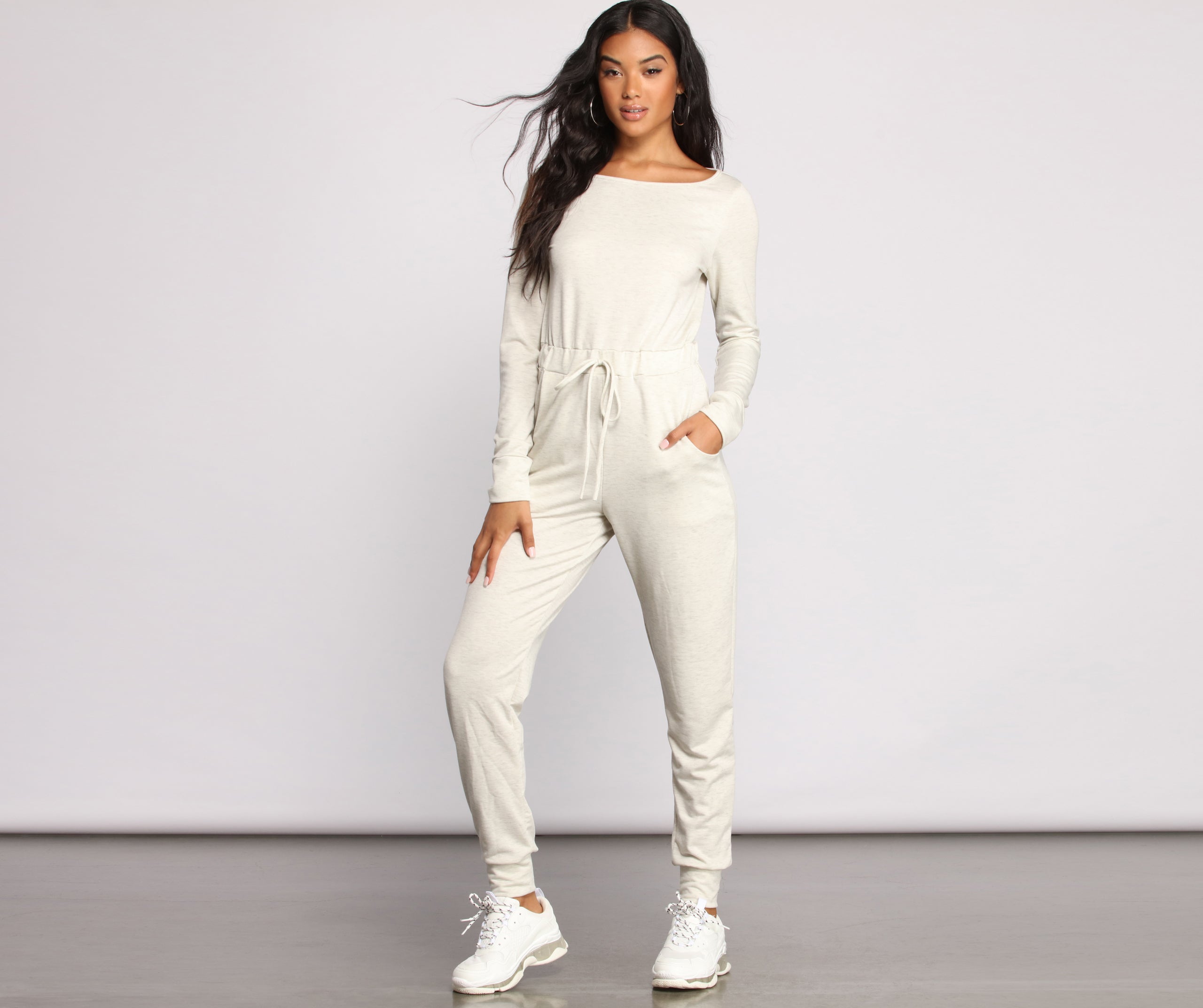 Get ready to chill out at home in this adorable catsuit! It features a tie waist. jogger pants and a soft knit fabric. Pair this adorable loungewear piece with chunky sneakers to get that casually cute vibe.