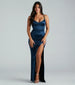 Capture the attention in the Kadia formal satin dress and steal the scene at the school dance or black tie soiree! She features a sleeveless V-neckline. adjustable spaghetti straps. an eye-catching lace-up back design. and a flattering mermaid silhouette that leads her floor-length hem with a high front slit. The formal dress is designed with sparkly rhinestone embellishments on the silky satin fabric to give you a luxe feel! Complete the look with a rhinestone clutch.