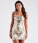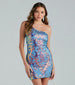 Bring the shine to prom in a sequin dress that illuminates the night! Kai features a trendy one-shoulder neckline. a bodycon silhouette that flaunts your curves. and a short-length hem. The dress is composed of a lined mesh fabric that offers minimal stretch and an all-over dazzling sequin scroll pattern. Complete the look with a silver purse and heels.