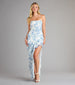 Let the Kailany charm you with beautiful. cascading ruffles and a delicate floral print while the high side slit offers an alluring show of leg along the floor-length silhouette.