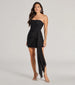 The lined mesh mini dress features flexible boning at the bodice to add structure. all-over ruching to showcase your curves. and a front draped design leading to a train that cascades down the side for a flowy chic accent. The short bodycon silhouette will flaunt your gorgeous figure. Style with stiletto heels for your next formal party.