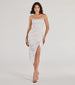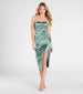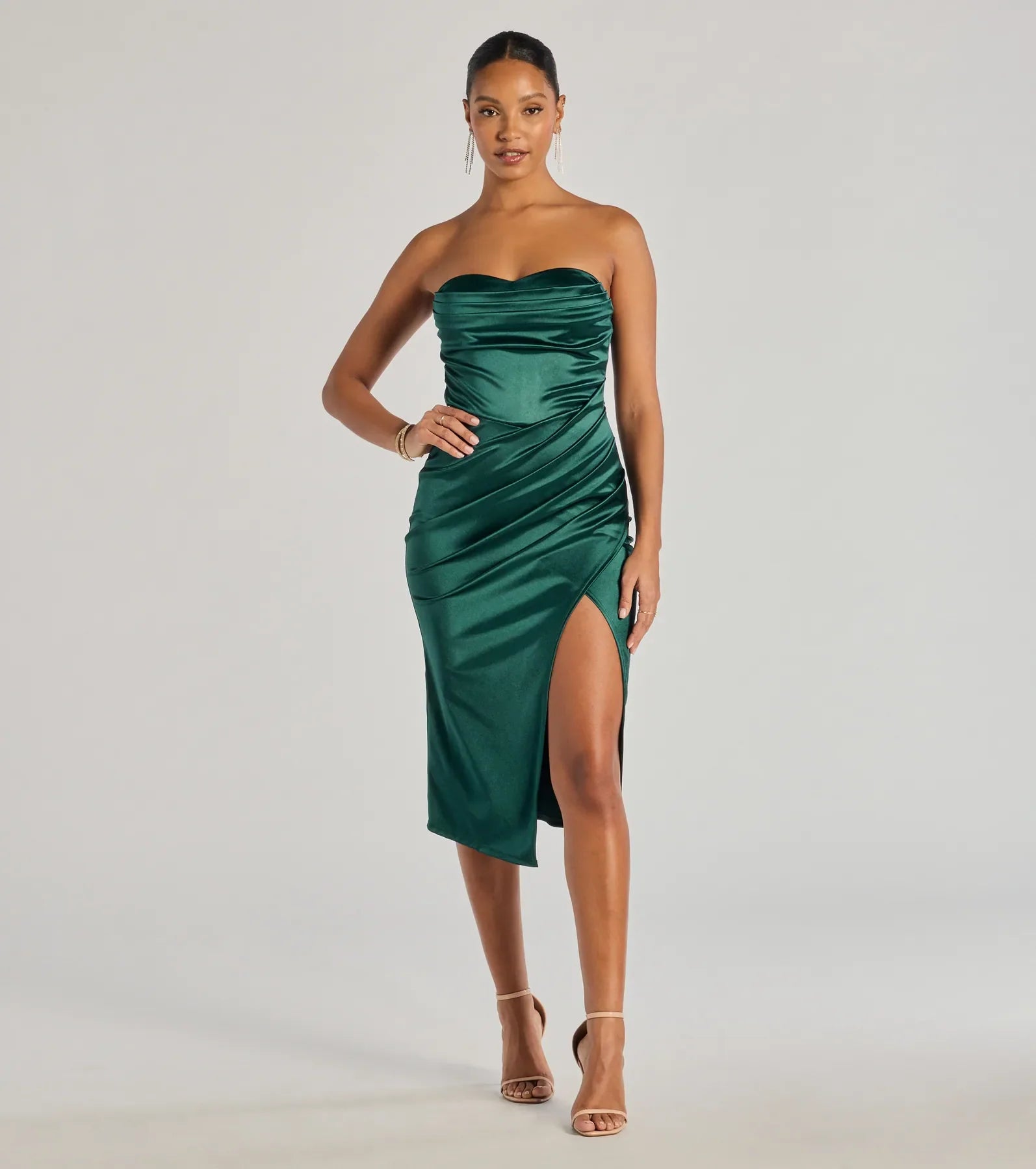 Bring elegance in a midi dress that features a sleeveless cowl neckline. ruching to enhance curves. and a wrap silhouette accented with a high-side slit. Complete the formal outfit with silver heels.