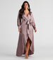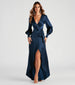 Sleek and stunning. the Kali formal satin wrap dress is the perfect wedding guest dress! She features a sleeveless V-neckline with a wrap-front design. long sleeves with tapered hems. a high waist seam with a tie-back design. a floor-length. wrap-front silhouette with a high front slit to showcase some leg. and a flowy fit. The smooth woven satin fabric includes a short knit lining. Style this dress with rhinestone earrings.
