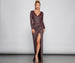Light up the room in the glitzy Karissa glitter knit wrap dress! She features a V-neckline with a wrap-front design. long fitted sleeves. a floor-length silhouette with a ruched wrap-front. and a chic thigh-high front slit. Complete the look with sparkling earrings and embellished heels.
