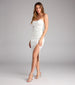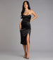 Elegant with just the right edge. the Karlie formal dress owns the room quietly but completely. Cut from glossy satin in a form-hugging silhouette. this strapless midi dress stuns with soft draping and a front slit that says you're not just arriving—you're making an entrance.