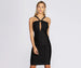 Chic and fab. the Katelyn ruched midi dress is a new go-to. She features a sleeveless bodice. a Y neck with halter straps. a knot detail. and a front keyhole cut out. and a square back with a zipper closure. Her high waist band leads to a curve hugging skirt with ruched side details and a mid-length hem. The dress is composed of a stretchy knit fabric with a pretty sheen.