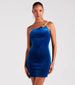 Flirty perfection for date night or a bachelorette. the glam Katelynn velvet dress will have you looking and feeling your best! She features a striking one-shoulder neckline with embellished rhinestone straps that shape a knot accent on the front. a bodycon silhouette that hugs your gorgeous curves. and a mini-length hem. The formal dress is composed of a soft velvet fabric for the perfect luxe feel! Complete the look with teardrop earrings and heels.