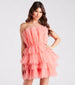 Capture the attention of the room in the Kayla ruffled tulle party dress that brings the voluminous fashion! She features a strapless square neckline with non-slip grip lining. an elasticized cinched waist. and a ruffled tiered short-length silhouette. The formal dress is composed of a tulle mesh fabric with a sewn-in knit lining and minimal stretch. Style with sparkly glitter heels and a chic clutch to complete the look!