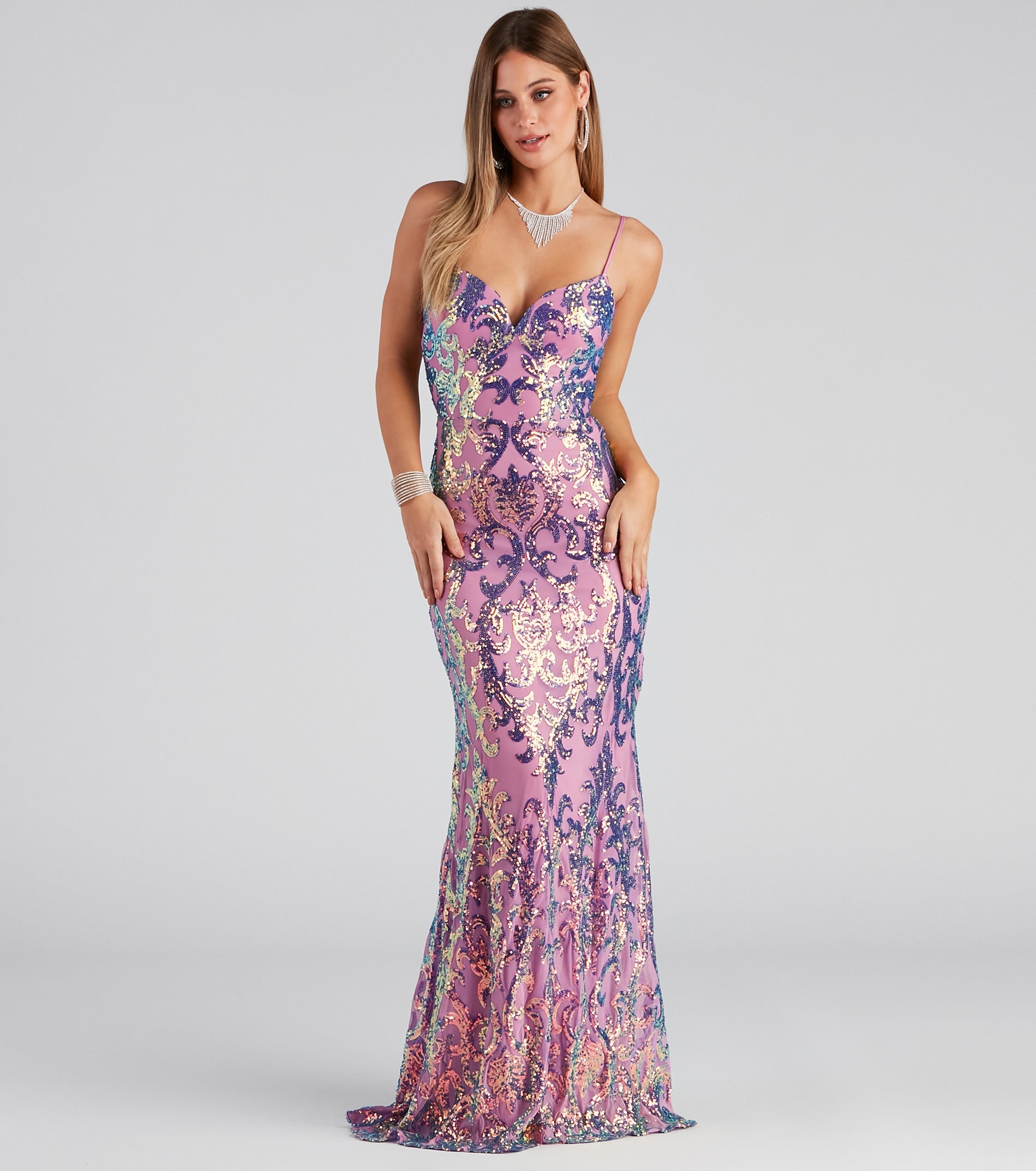 Look and feel like royalty in the Kazia formal sequin dress to create a memorizing entrance at prom! She features class and grace in a sleeveless. sweetheart neck with thin spaghetti straps and a built-in padded bust. and a low-cut back with tie closure. Her form-fitting bodice leads to a mermaid floor-length hem that showcases your flattering figure. The formal dress is composed of a sequin embroidered fabric with inner lining and no stretch. Complete the look in statement earrings.