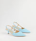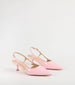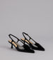 Keep it chic and sleek in these fab patent faux leather pumps featuring a closed pointed toe. an adjustable slingback strap. and a low kitten heel.