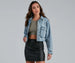 Keep your look cute and chill with this relaxed-fitting denim jacket. It features a collared neckline. long sleeves. a complete button-down front. chest pockets. and a mid-length. raw cut hem. Style this jacket with combat boots.