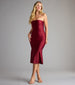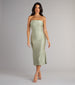 The midi dress features a sleeveless square neckline. ruching. and a pleated mermaid silhouette that adds flair to your look! Complete the outfit with a sleek clutch.Â
