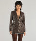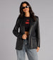 Keep your fall and winter wardrobe trendy with this sleek faux leather blazer! It features a lapel collar. an open front with a single button closure. long sleeves. front pockets. and a chic oversized fit. The faux leather fabric includes a smooth lining. Style over a corset top and mini skirt.