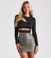Keep it bold in this crop top that dares to show off a hint of skin. The top features a crew neckline. an asymmetrical cutout at the bust. long fitted sleeves. a cutout at the hem. and a cropped hem. The top is composed of a brushed knit fabric that offers a form-hugging fit with plenty of stretch. Complete the look with a wrap skirt and thigh-high boots.