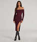 Keep it chic in this knit midi dress boasting an off-the-shoulder neckline and trendy button accents that lead to a flirty slit. Pair with boots.