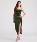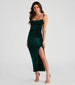Luxurious velvet creates the elegant Kerry formal midi dress destined to be the hit at every party! She features a sleeveless cowl neckline. spaghetti straps that cross along the back. and side ruching to accentuate your curves along the bodycon midi-length hem with a high-cut side slit. The formal dress is composed of a soft velvet knit fabric with minimal stretch. Complete your dressy look in glitzy strappy stiletto heels.