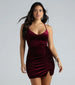 Stroll in looking so luxuriously sultry in the Kinley velvet party dress for bachelorettes or birthdays! She features a sleeveless V-neckline. a padded bust. spaghetti straps that lace up across the back. a flattering bodycon silhouette. a front ruched seam. and a flirty slit on the mini-length hem. The party dress is crafted from a soft velvet fabric that has a stretchy knit lining. Complete the look with a rhinestone bracelet and earrings to add glam to your night!
