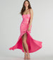 Gorgeous and glam. the Kinsley formal sequin mermaid dress will give off major regal energy. She features a sleeveless square neckline. spaghetti straps that lead to a cross-back lace-up design. a floor-length skirt with a mermaid silhouette. and a high side slit to showcase some leg. The lined mesh fabric features all-over sequin embroidery in a luxe scroll pattern. Complete your formal affair look with gold hoops and neutral heels.