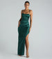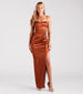 Light-catching satin on the Kira formal dress highlights your sense of style this party season! She features a sleeveless sweetheart neckline. sleek spaghetti straps. a pleated side seam atop her sultry high slit. a flattering slim silhouette. and a long hem. The formal dress is crafted from a smooth and silky satin knit fabric that brings the luxe to your night! Complete the look with sparkly earrings and a clutch for a school dance or fancy dinner banquet.