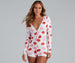 Pucker up cutie! Make 'em' wink when they see you in this kiss lip print pajama romper perfect for snuggling up on the couch after dinner. It features fitted long sleeves. a plunge V-neckline with button trims. a form-hugging silhouette. and a cheeky hem. Complete the look with this cute sock set.