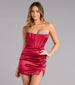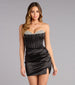 Designed for the spotlight. the Kris satin bodycon mini dress pairs a strapless sweetheart neckline edged in rhinestone gems with a corset bodice that sculpts and shines. Hip pleating and a daring slit finish the look with just the right dose of drama.