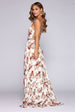 Make a captivating entrance in florals! Krystal enchants the room with her sleeveless bodice. square neckline and bold open back with a lattice back. Her slim fit bodice leads to a sweeping floor length   A Line silhouette. Her all over floral print features pink and mauve hues that complement the ivory background.Â