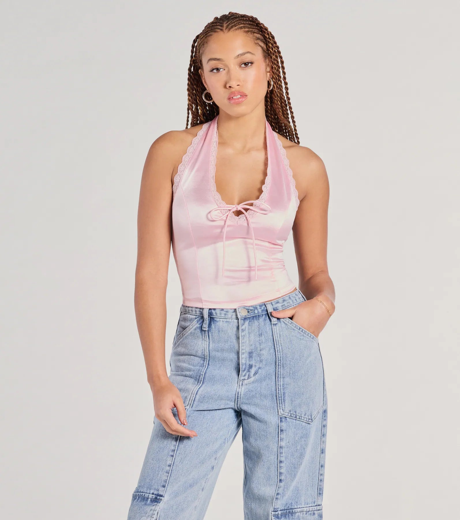 Have them swooning in this halter satin crop top. With a lace-trimmed V-neck and open back. this silky satin piece is perfect for your next night out.