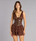 This lace corset mini is equal parts sweet and daring — with a deep V neckline. faux leather lace-up bodice. and tiered lace skirt that moves like you already own the room. It's that perfect mix of romantic texture and confident structure.