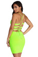 Lace up in bright hues to get your glow on! This neon green dress features a sleeveless bodice. a plunging V neckline and narrow shoulder straps that lead to a cross back design. The relaxed fit bodice leads to a curve hugging mini length silhouette.