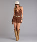 Sweet but with a little spice—this lace romper stuns with a plunging V neckline. open tie back. and playful ruffle trim. Perfect for lunch dates. garden parties. or just stealing the spotlight.