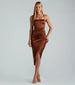 You'll be the lady of the hour in this satin midi dress at every soiree! The dress features a sleek square neckline. spaghetti straps. and a pleated side seam that creates the form-hugging silhouette with an asymmetrical midi-length slit hem. Complete the look with a glamorous necklace and earrings set.