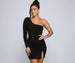 Create an enchanting moment with a formal dress that stands out as a true one of a kind! Lalana features a one-shoulder neckline. a fitted long sleeve with a padded shoulder. ruching. a mini side slit. and a mini-length silhouette. The dress is composed of a lined crepe fabric that offers a form hugging fit with a moderate stretch. Complete look with rhinestone stilettos and rhinestone hair clips to create a fab side part.