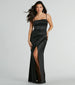 The Lana satin glitter formal dress is guaranteed to make a glamorous impression at black-tie galas and parties! Designed to sparkle. this floor-length gown memorizes in a cowl neckline adorned with adjustable spaghetti straps to customize the fit and features padded bra cups for support. Achieve an hourglass appearance with her corset-inspired bodice with flexible boning and side pleated seam that creates the mermaid silhouette showcasing a high front wrap slit. Complete the look with an envelope clutch purse and heels for a sophisticated evening ensemble!