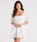 This lace babydoll dress speaks your language for romance! Let this short dress sweep you off your feet for wedding showers. graduations. or birthday brunches! It features three-quarter-length puff sleeves. a square neck. a stretchy smocked back. and an empire waist seam that flares out into the flowy hem. Complete the look in new sandals and a clutch!