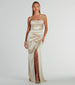 The perfect evening starts with the Laurel formal satin dress to create a breathtaking entrance as a bridesmaid. wedding guest. or at a red carpet event! She features a classic sleeveless cowl neckline. adjustable spaghetti straps. an open back with a tie-back design. and a side pleated seam that creates her mermaid wrap-style silhouette with an asymmetrical slit and floor-length hem. The formal long dress is composed of a luxurious silky satin-lined fabric with minimal stretch. Complete the look in platform block heels.