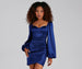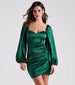 Look ravishing in this lavish satin mini dress on your next girl's night out! It features long bishop sleeves. a sweetheart neckline. a corset-designed bodice with flexible boning inserts for a structure. side ruching. a faux wrap mini-length hem. and a bodycon silhouette. The silky satin fabric has a minimal stretch. Complete the look in this mini dress with glitter heels.