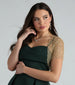 Layer on this glamorous mesh bolero to elevate your formal wear! The sheer bolero features short sleeves. an open front design. a cropped hem. and a striking glitter fishnet pattern with faux pearl embellishments. Complete your dressy look with a chic clutch.