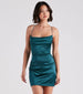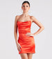 Watch the party come to life when you make an appearance in the Leanna satin mini dress perfect for celebrations! She shines in a sleeveless cowl neckline. bodycon silhouette. and sleek bungee spaghetti straps that shape the strappy. open-back design. The formal dress is composed of lined stretch satin fabric with a glossy sheen. Style with rhinestone heels and a clutch to complete the look!