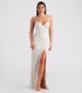 Give everyone something to talk about when they catch sight of you in the Leanne formal dress to bring radiance to dinner parties and ceremonies! She stuns in her sleeveless V-neckline. adjustable spaghetti straps. and a surplice bodice with a pleated side seam to accentuate your curves. Her form-hugging fit at the hips leads to the asymmetrical wrap long hem with a sultry front slit. The formal dress is composed of a glittery lace mesh fabric with a knit lining and minimal stretch. Style with hoop fringe earrings and heels to complete your dressy look!