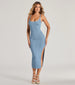 Leaving an impression will be easy with this sleeveless knit midi dress! Perfect for vacation or a weekend spent at the beach. this dress features a flattering scoop neckline. spaghetti straps. a head-turning twist cutout back design. a bodycon fit. and a sultry side slit along the midi-length hem. Complete the look in strappy espadrille wedges.