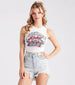 Give your casual 'fit an edgy update with this cropped graphic tank! It features a muscle tank design with a sleeveless crew neckline. tank shoulder straps. a racecar and flags graphic with the scripts. "Legendary Rider." "Fast And Loud." and "Built For Speed." trendy side ruching. a lower back cutout with tie-back straps. and a fitted cropped hem. Style with distressed denim shorts and sneakers.