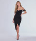 Sparkle up the party in the gorgeous Lennon formal midi dress designed with glitter knit fabric for a glam sheen that will turn heads. It features an off-the-shoulder sweetheart neckline with a ruched padded bust and short sleeve cuffs. a ruched faux wrap-front design creating a chic slit to showcase some leg. and a midi-length form-hugging silhouette.