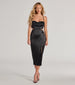 Showcase your gorgeous silhouette in the Leona satin bodycon midi dress featuring a sleeveless sweetheart neckline accented with a pleated cowl overlay. and spaghetti straps leading to an open lace-up strappy design for a customized fit. The sultry side cutouts at the waist and the high-cut side slit add a bold allure. Complete your stunning cocktail party look with stiletto heels.