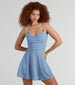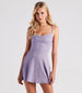 You'll be glowing in this glitter skater dress to shine at graduation parties. rehearsal dinners. and birthdays! It features a sleeveless cowl neckline. spaghetti straps. a glam rhinestone back strap with a lower cutout. and a short fit and flare silhouette. Complete the look in rhinestone platform heels for extra shimmer!